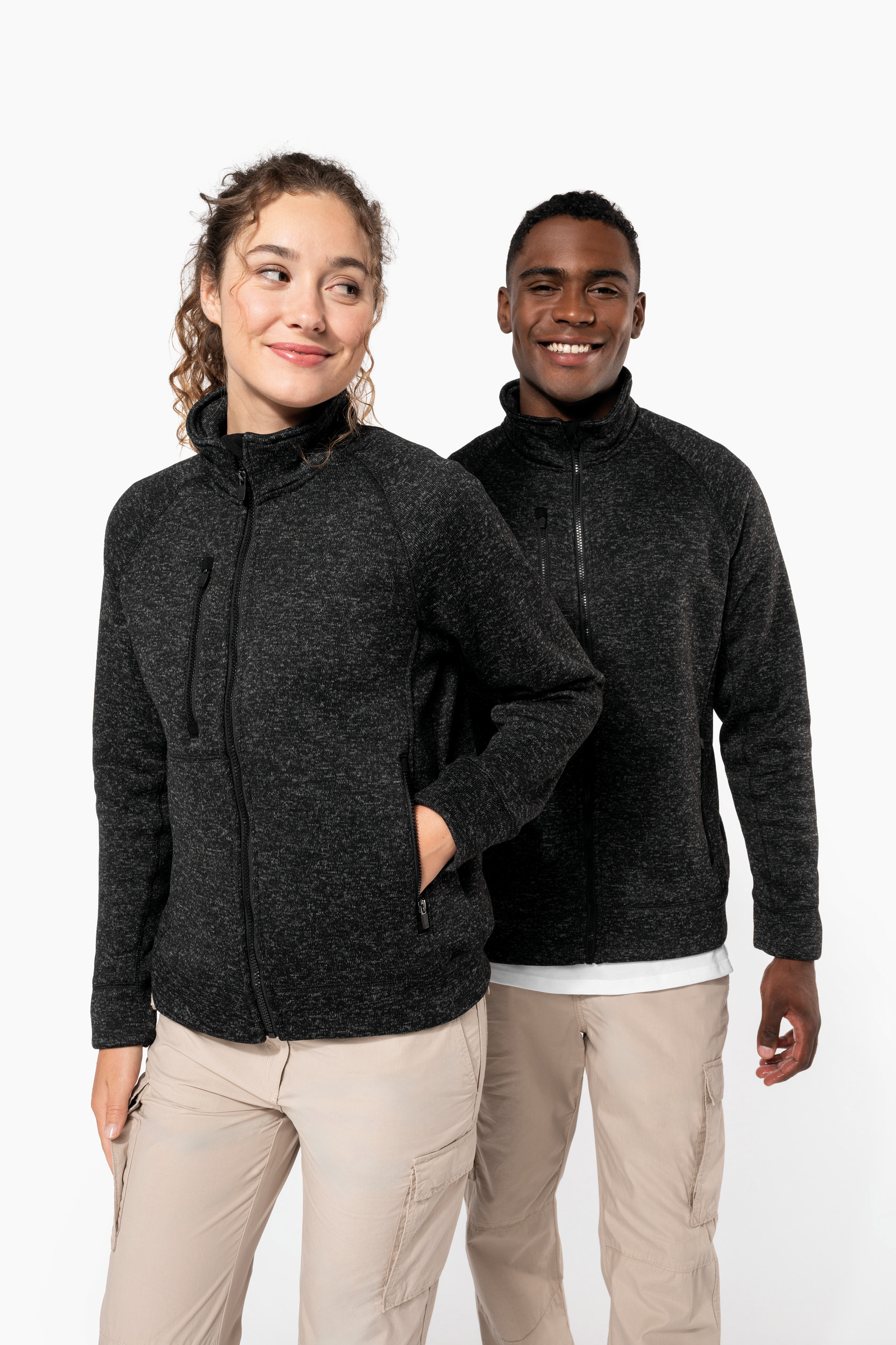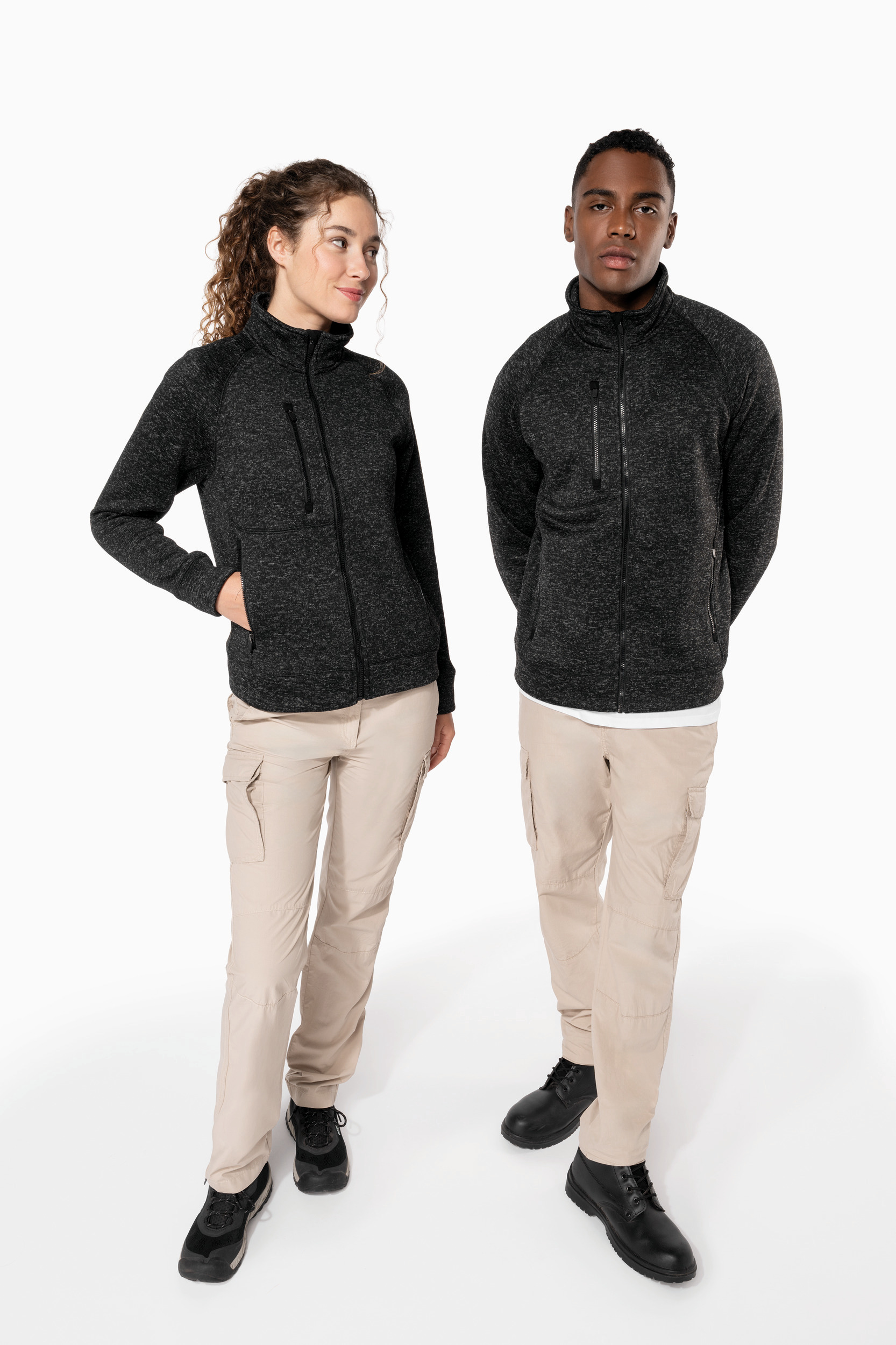Tricot intérieur gratté 100% polyester. Manches raglan. Fermeture zippée. 2 poches zippées contrastées devant et 1 poche poitrine zippée contrastée. Point de recouvrement sur les découpes. Coupe et matière très confortables.
