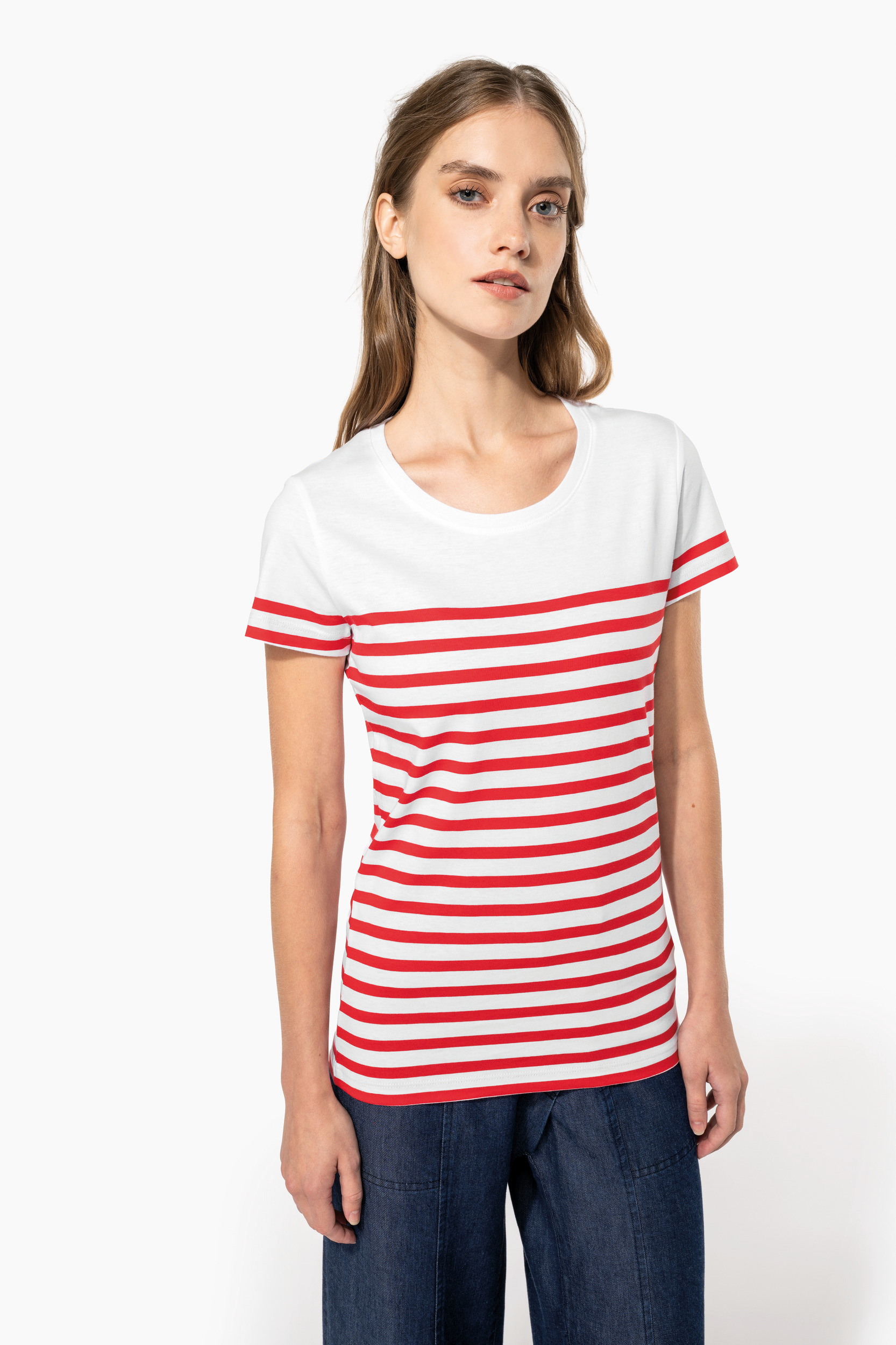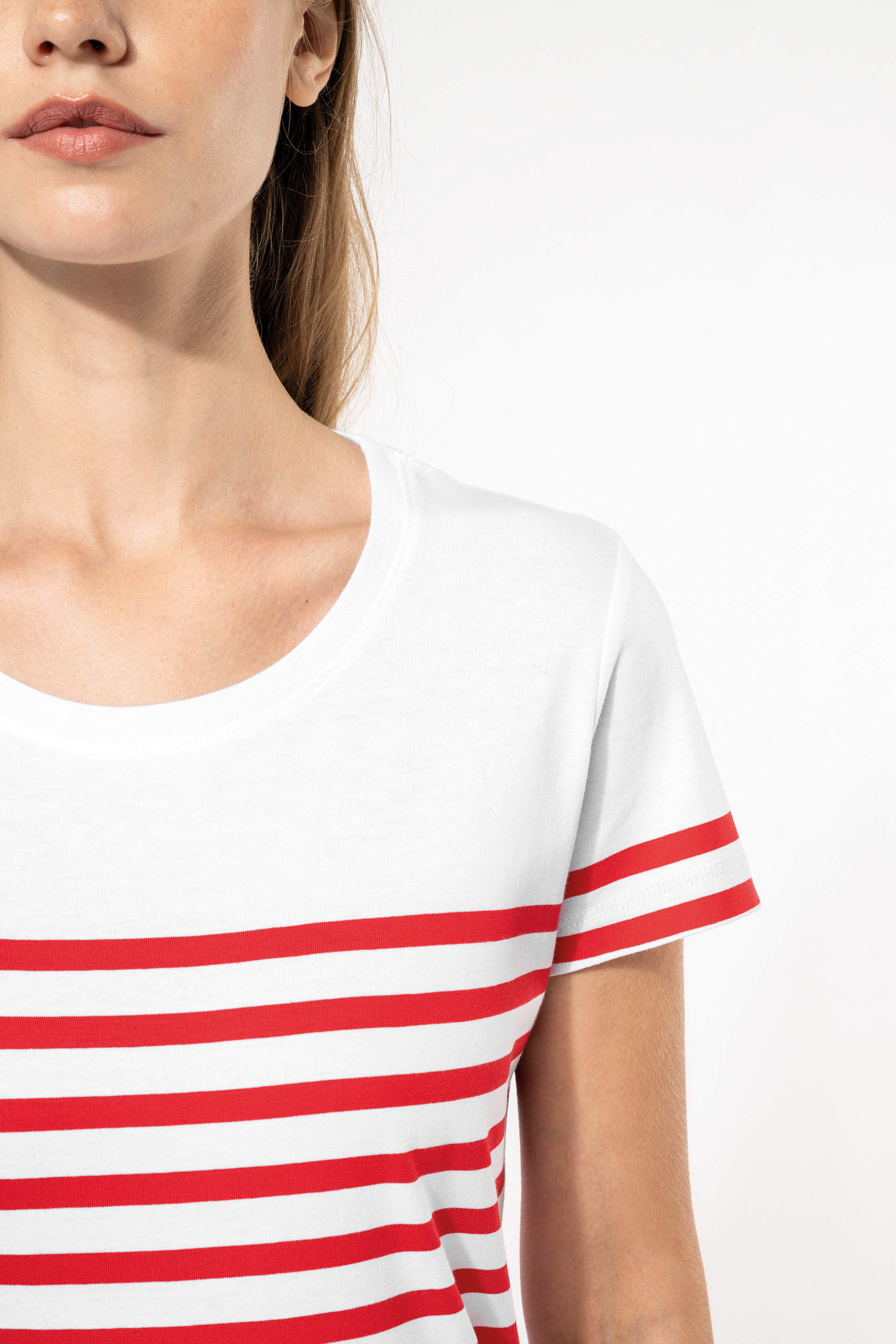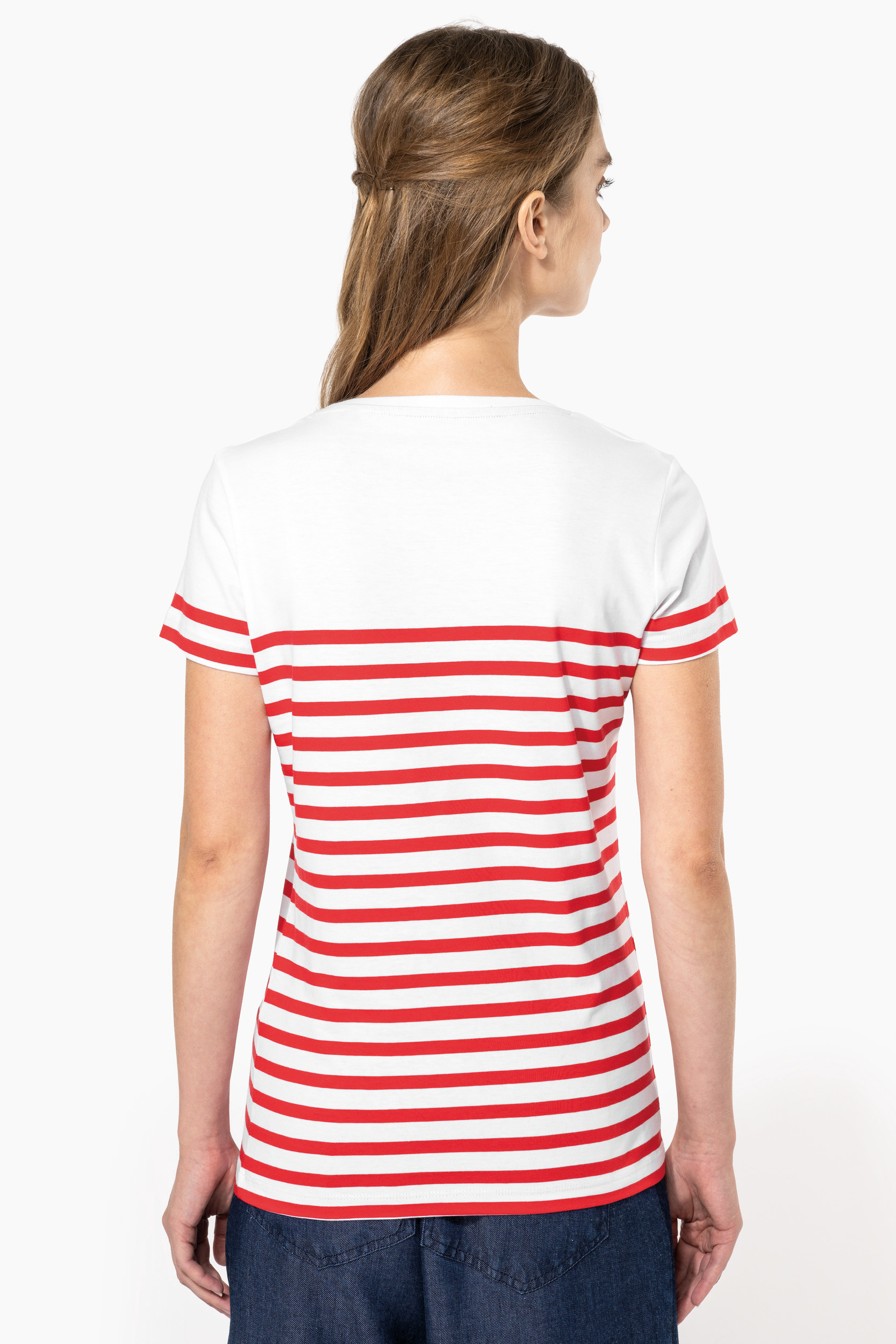 100% coton biologique. Coupe droite. Lavage aux enzymes. Encolure ronde avec bord-côte 1x1. Rayures tricotées. Bande de propreté au col. Finition double aiguille bas de manches et bas de vêtement. Pas d'étiquette de marque pour faciliter la personnalisation.