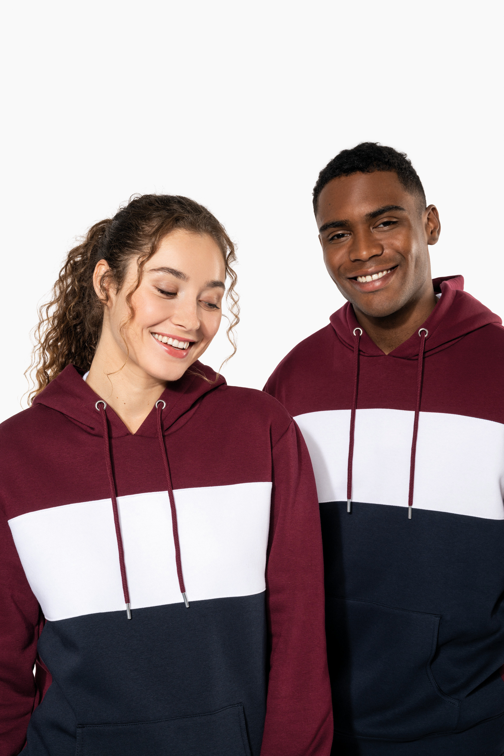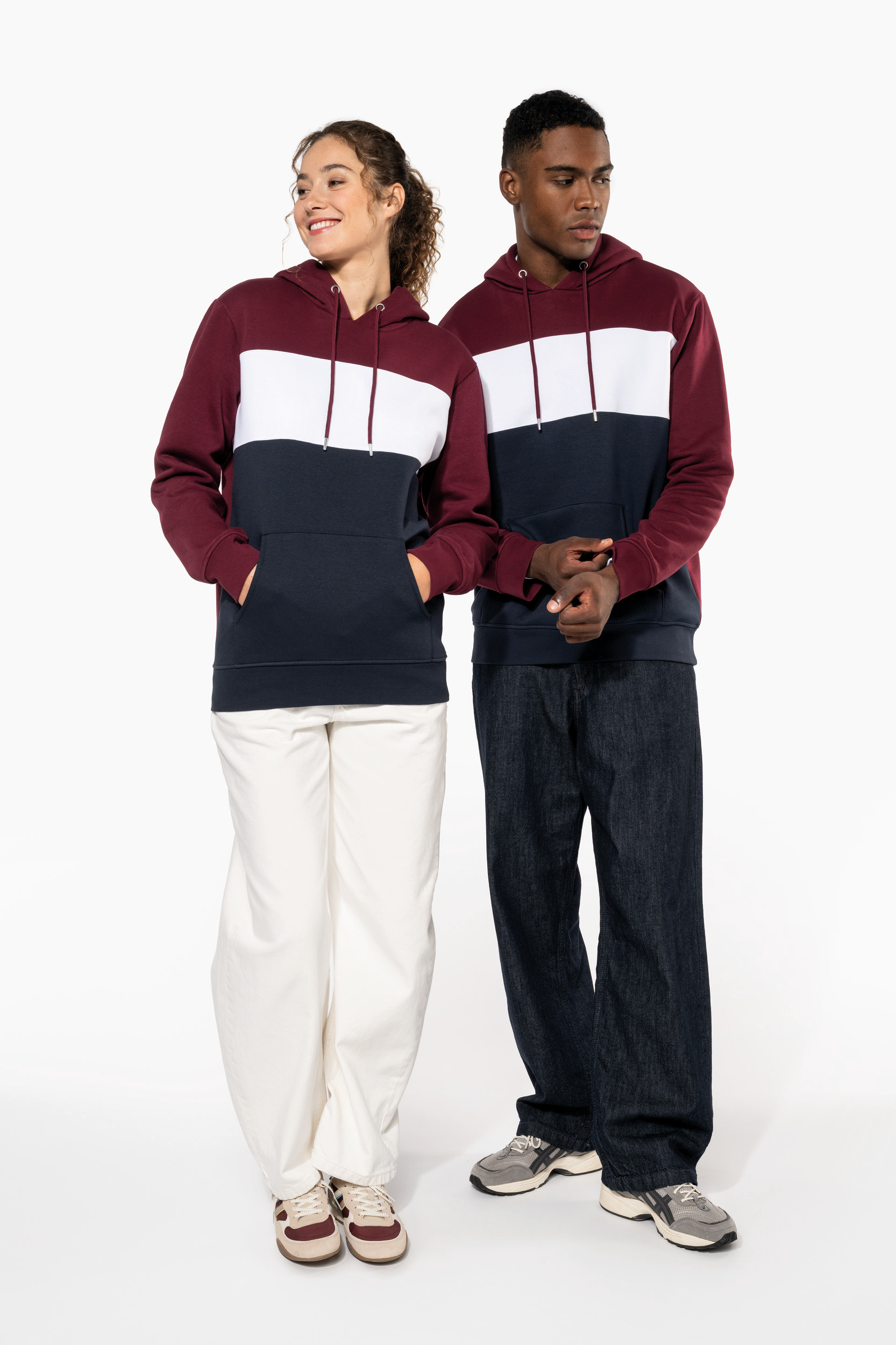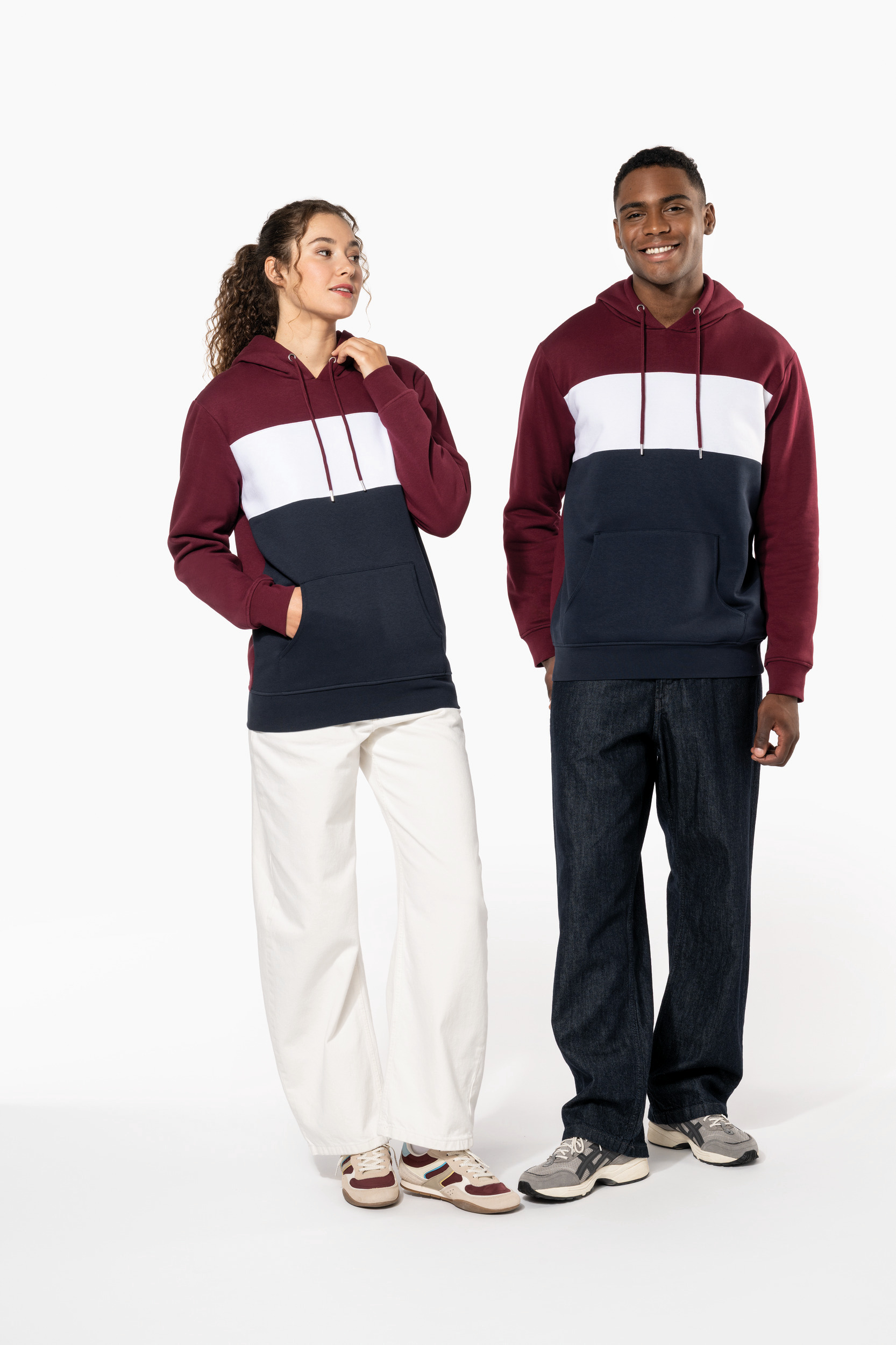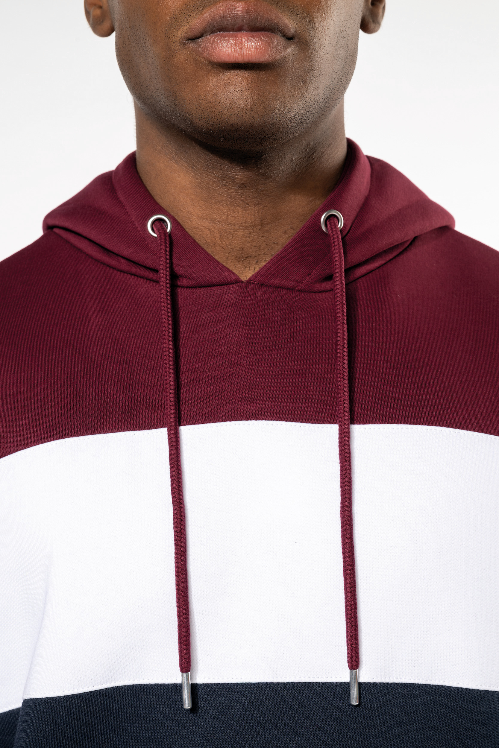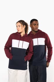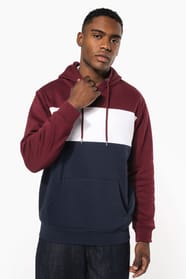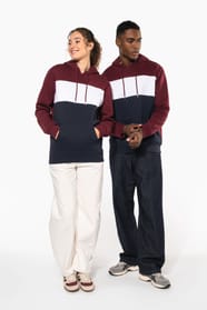 80% coton / 20% polyester. Surface extérieure 100% coton peigné. Molleton gratté 3 fils. LSF (Low shrinkage fleece). Lavage aux enzymes. Coupe droite. Sweatshirt capuche tricolore avec bande blanche centrale sur toutes les couleurs. Finition bords côte 1x1 bas de manche et bas de vêtement en tubulaire pour une meilleure finition, avec surpiqûre. Poche kangourou avec double surpiqûre. Capuche à plis avec œillet et embouts cordons en métal, avec cordons de serrage ronds. Bande de propreté en chevrons ton sur ton. Présence d’élasthanne sur bas de manches et de vêtement pour éviter que le vêtement se déforme. Demi-lune au dos pour faciliter la personnalisation. Etiquette de marque au col ainsi qu’une puce de taille déchirables pour faciliter la personnalisation.