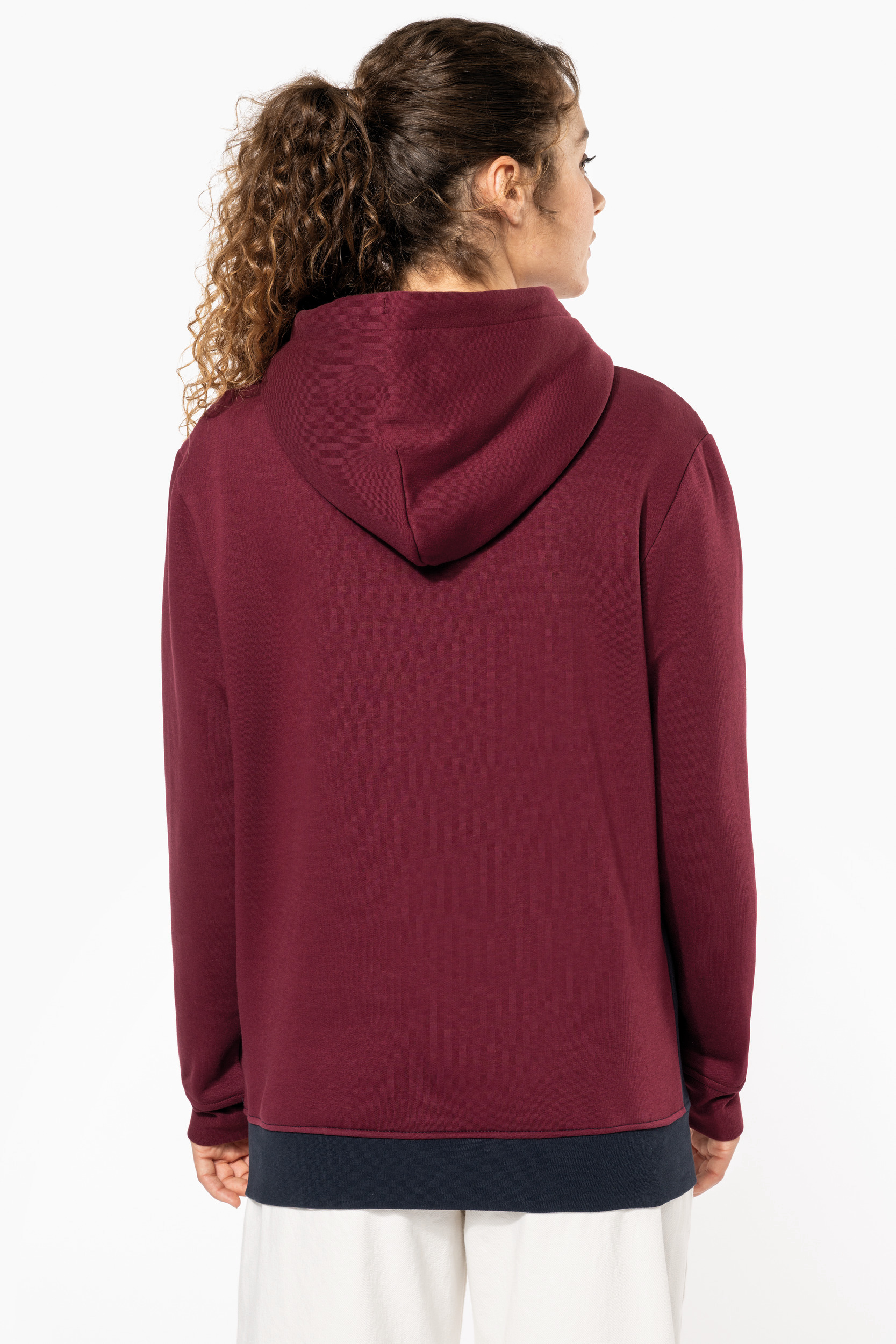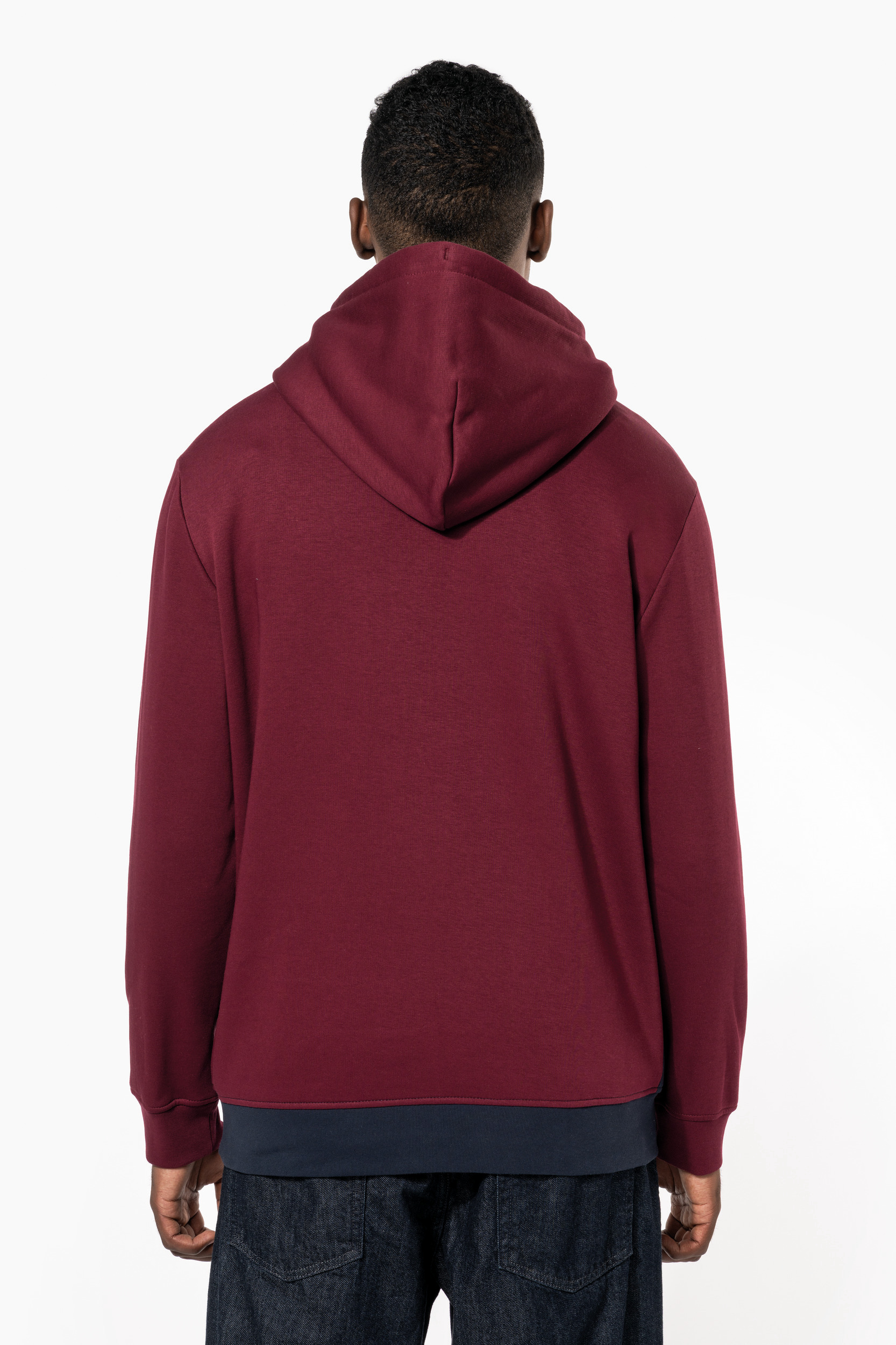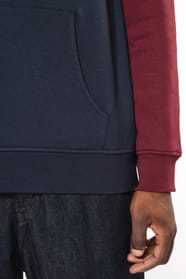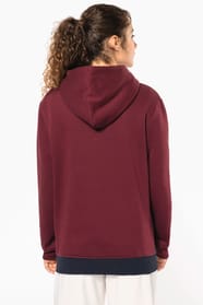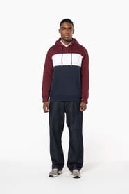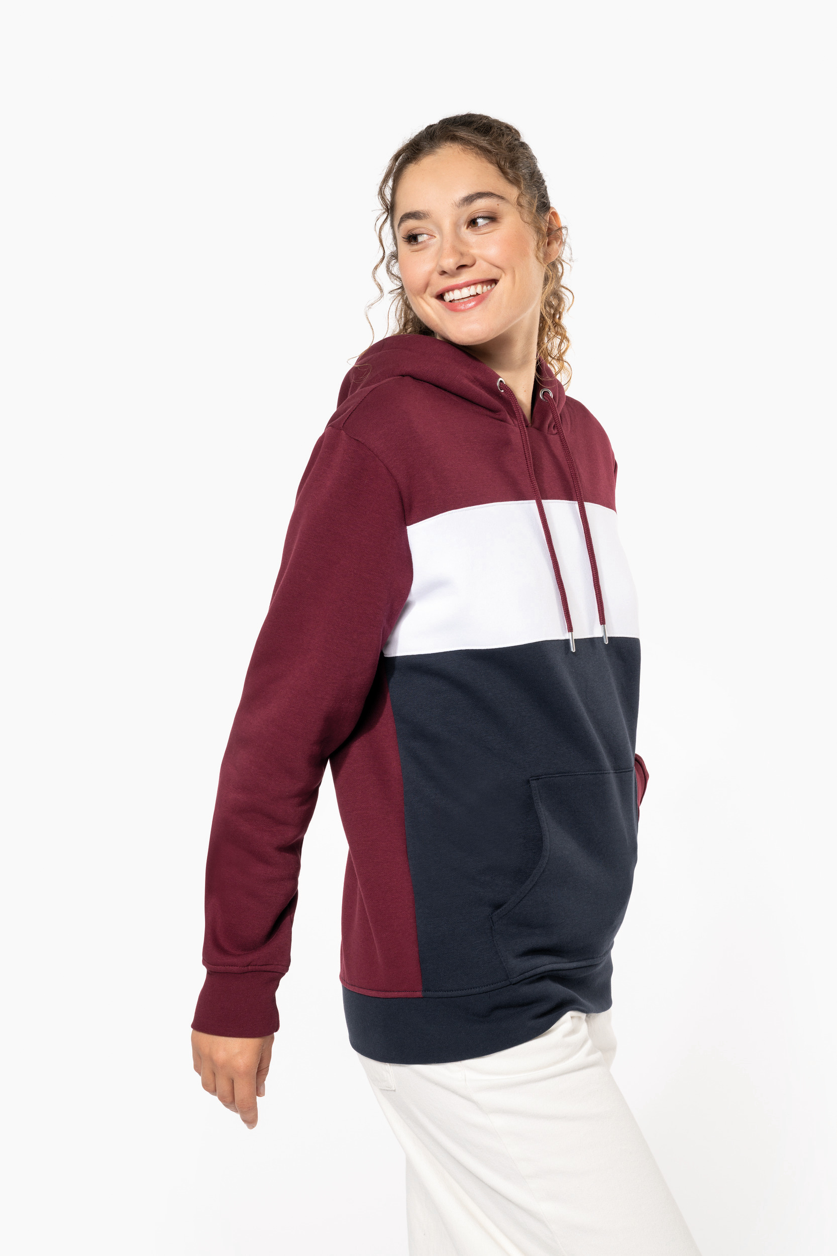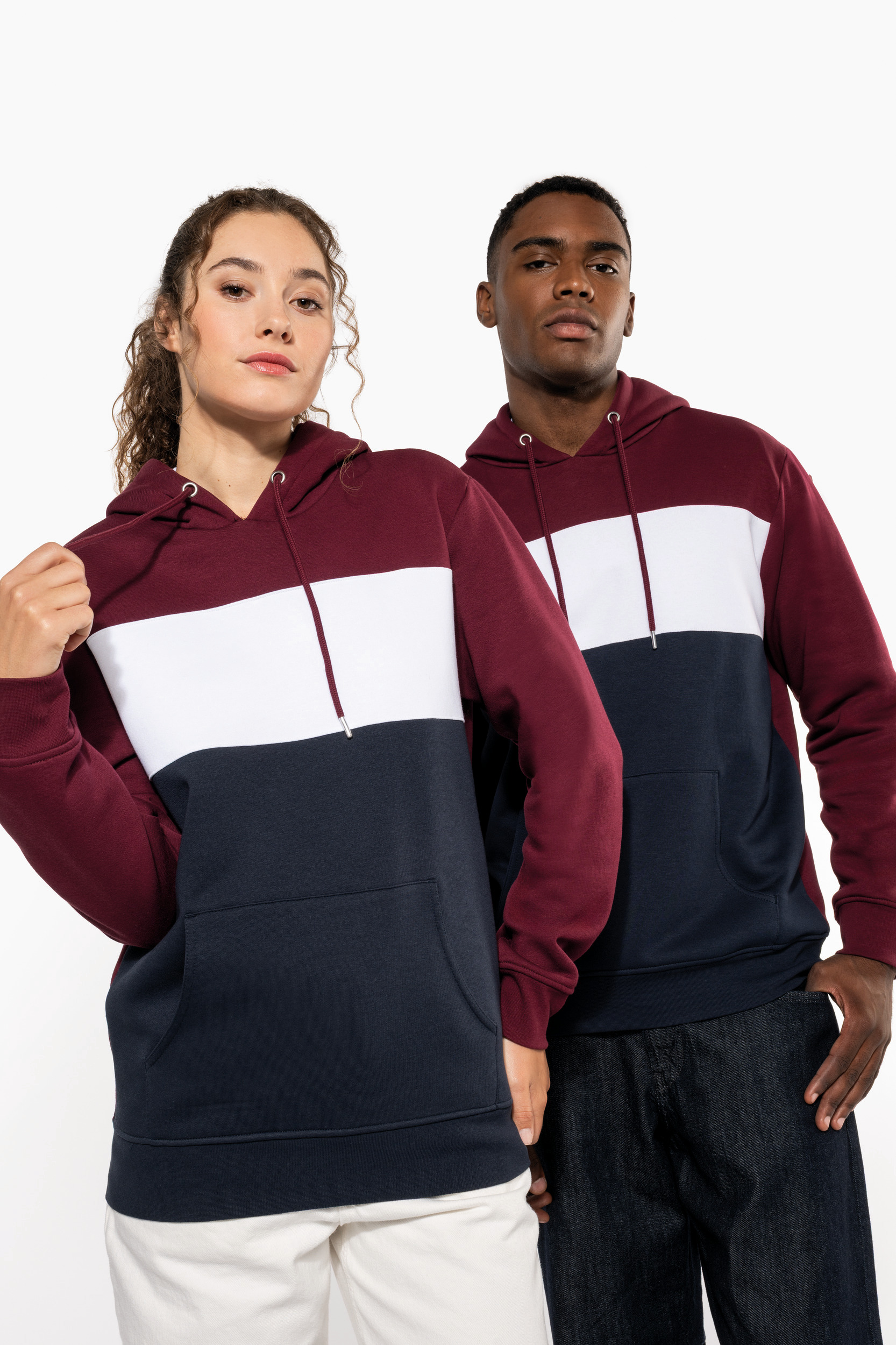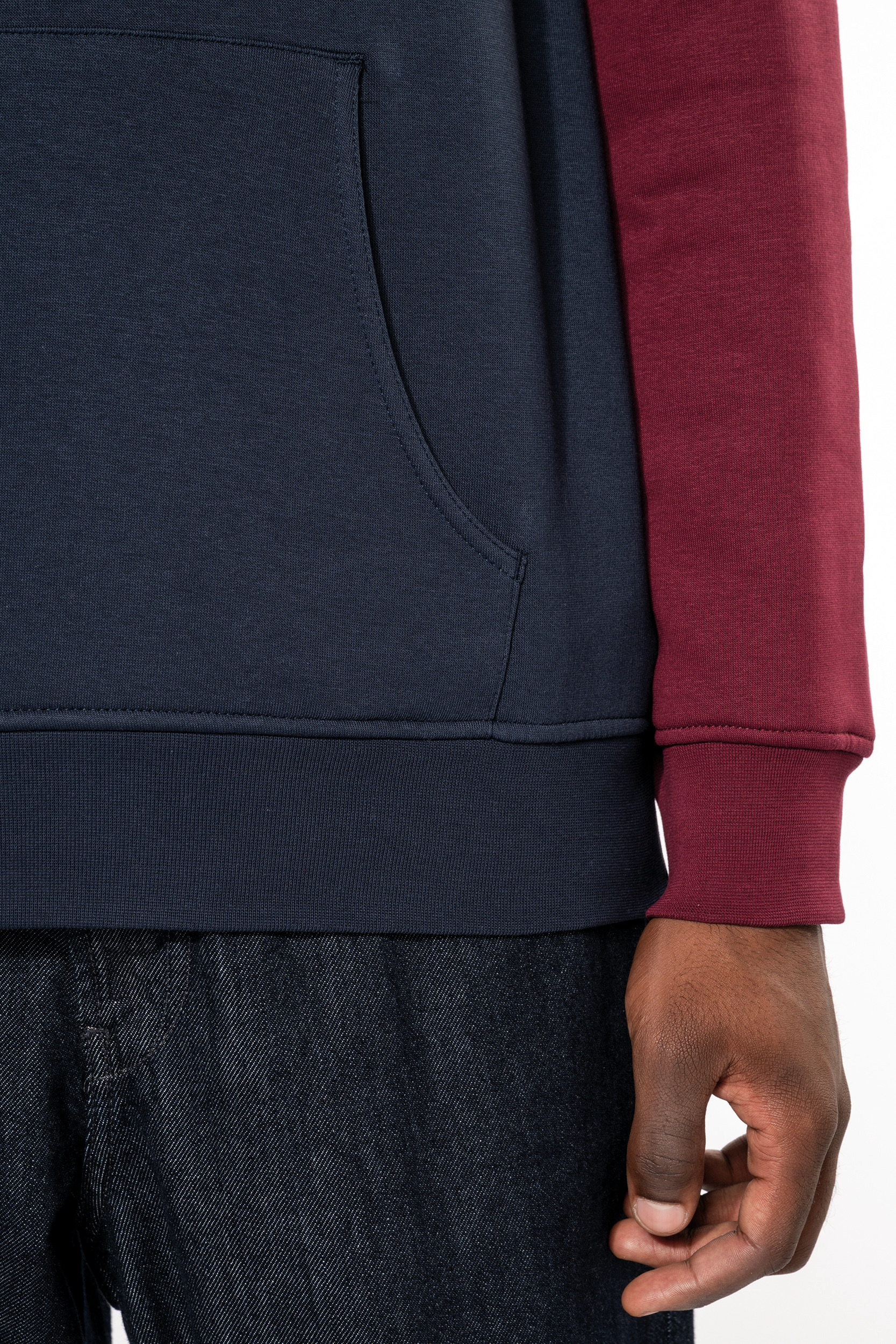 80% coton / 20% polyester. Surface extérieure 100% coton peigné. Molleton gratté 3 fils. LSF (Low shrinkage fleece). Lavage aux enzymes. Coupe droite. Sweatshirt capuche tricolore avec bande blanche centrale sur toutes les couleurs. Finition bords côte 1x1 bas de manche et bas de vêtement en tubulaire pour une meilleure finition, avec surpiqûre. Poche kangourou avec double surpiqûre. Capuche à plis avec œillet et embouts cordons en métal, avec cordons de serrage ronds. Bande de propreté en chevrons ton sur ton. Présence d’élasthanne sur bas de manches et de vêtement pour éviter que le vêtement se déforme. Demi-lune au dos pour faciliter la personnalisation. Etiquette de marque au col ainsi qu’une puce de taille déchirables pour faciliter la personnalisation.