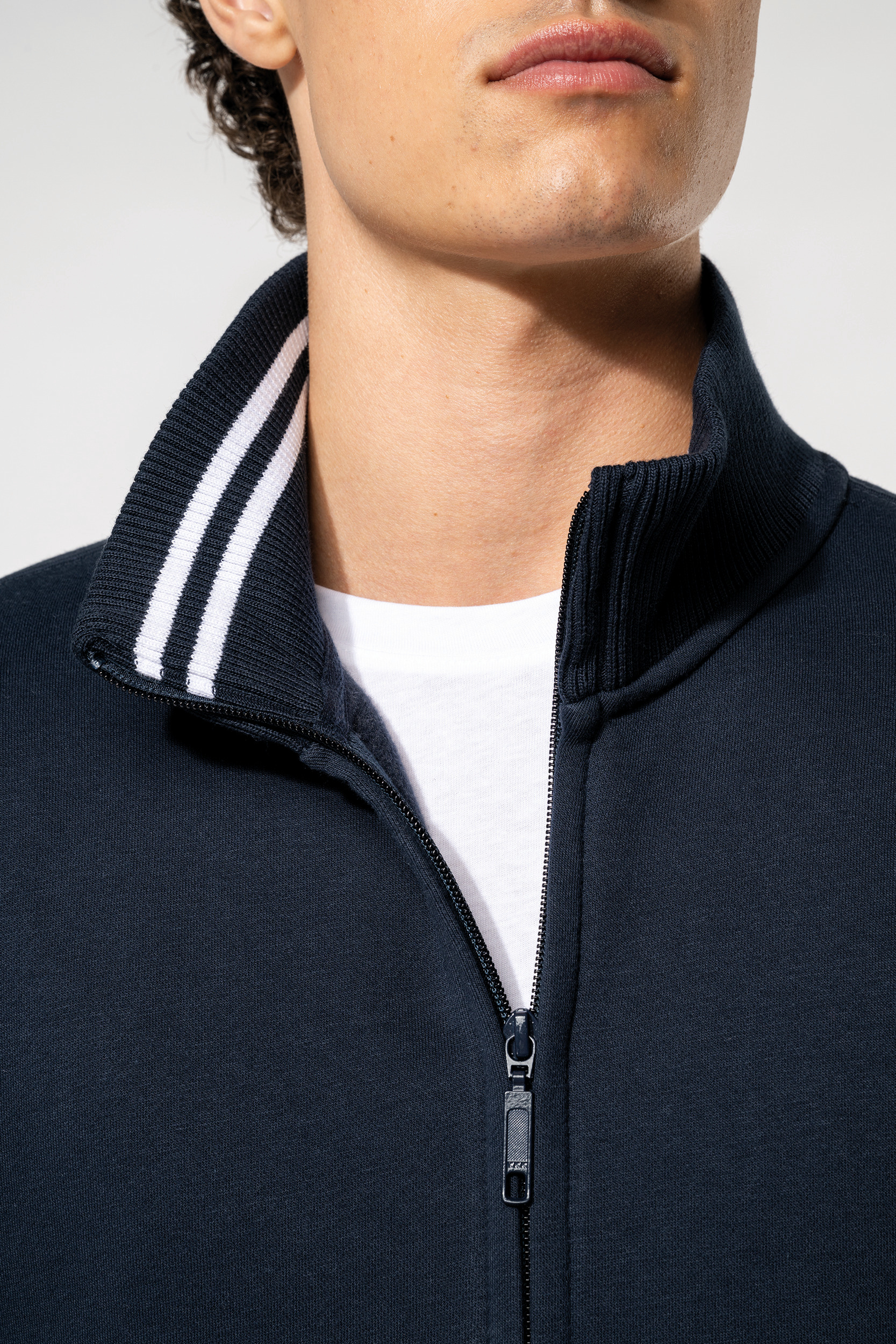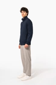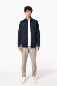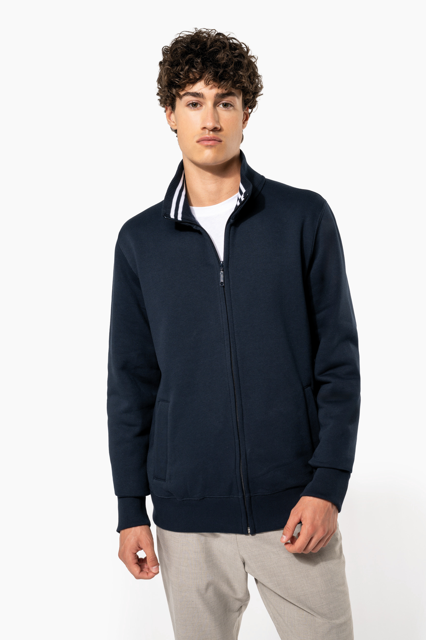 80% coton / 20% polyester. Coton peigné. Traitement LSF (Low Shrinkage Fleece) : molleton gratté et prérétréci. Lavage siliconé. Coupe droite par une découpe latérale en bord-côte. Intérieur col bord-côte avec rayures contrastées (Oxford Grey pour coloris White et White pour les autres coloris). Bande de propreté ton sur ton sauf pour coloris White : bande de propreté contrastée Oxford Grey. 2 poches devant. Finition bord-côte bas de manches et bas de vêtement. Fermeture zippée.