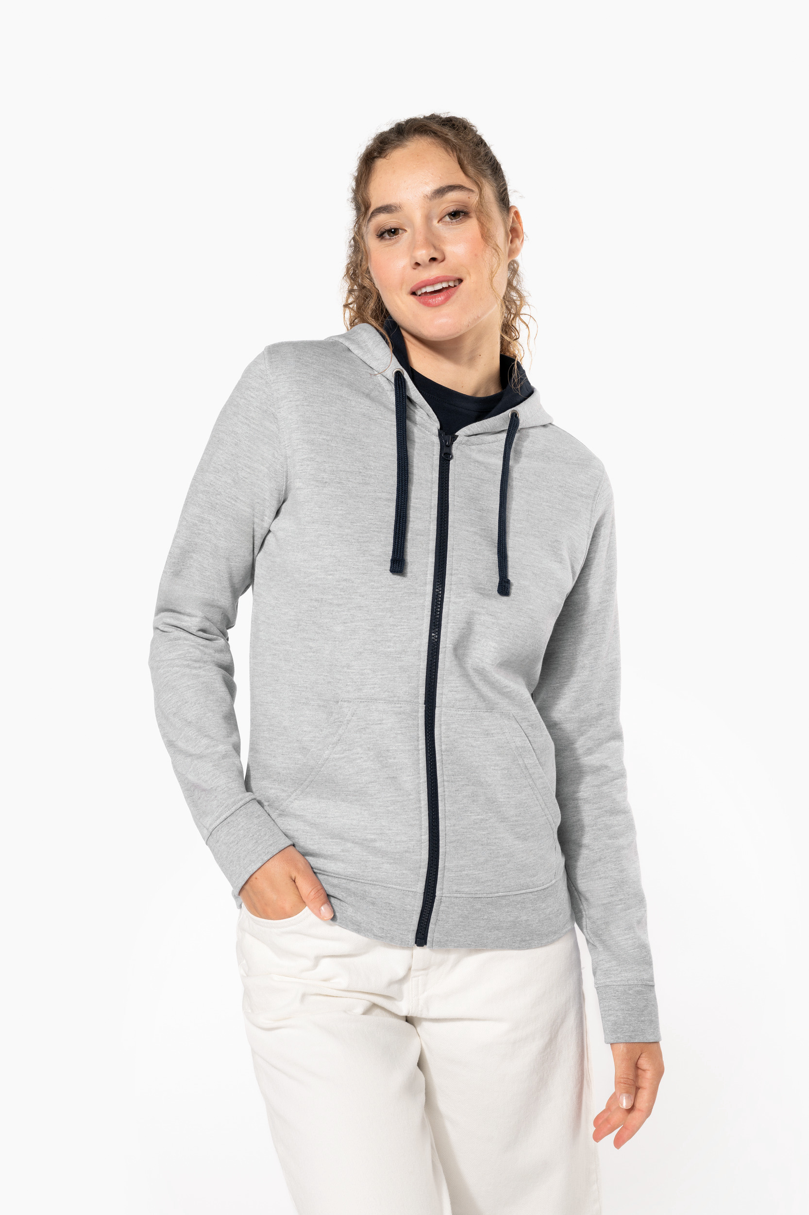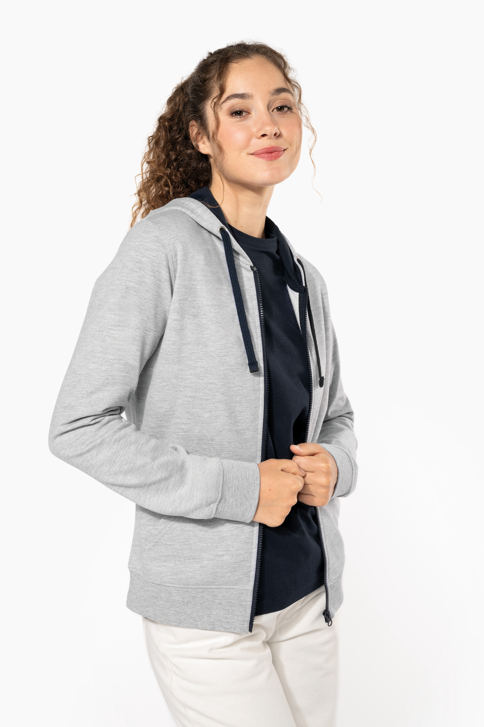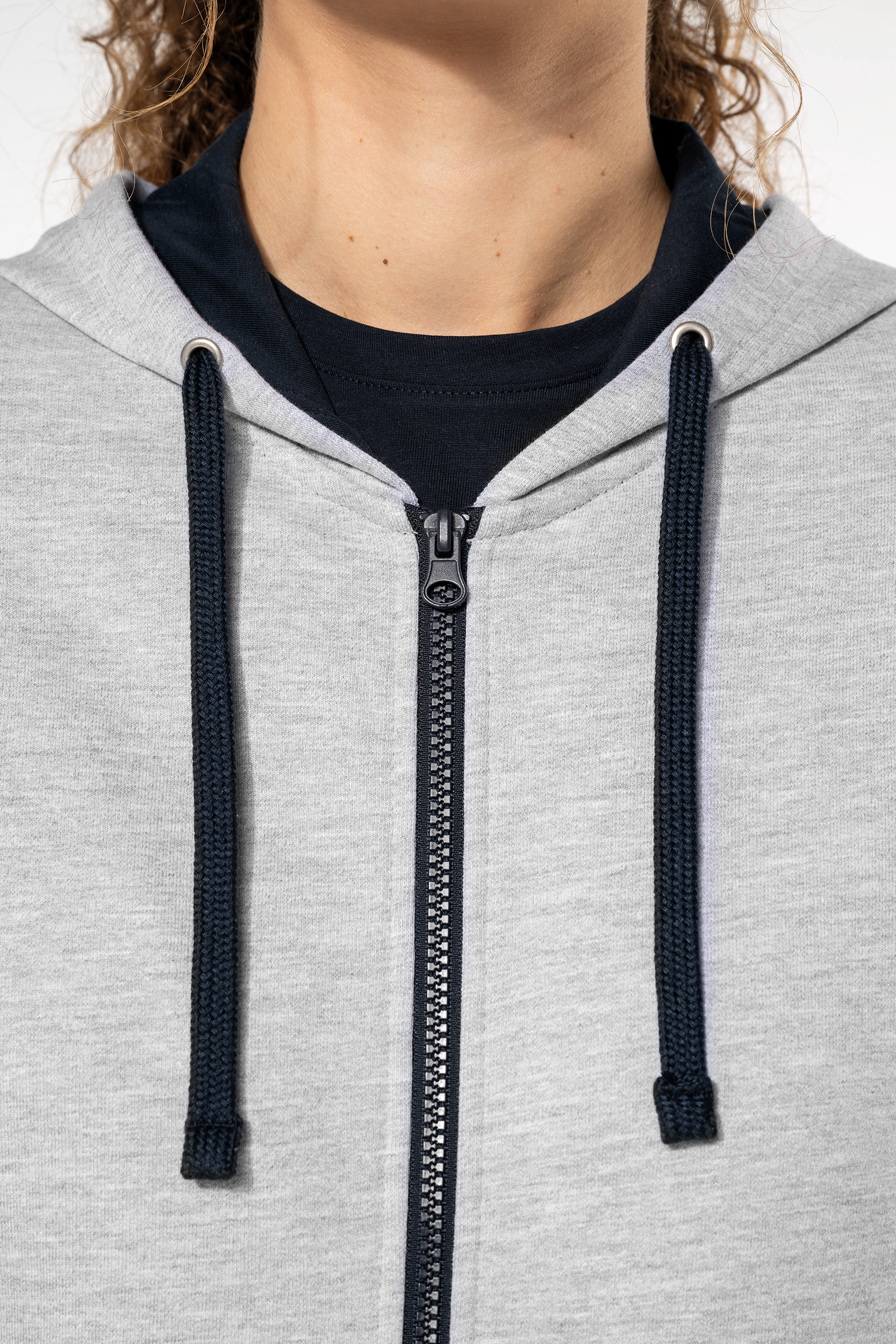 - Passe fil pour écouteurs dans la poche kangourou et à l'encolure.