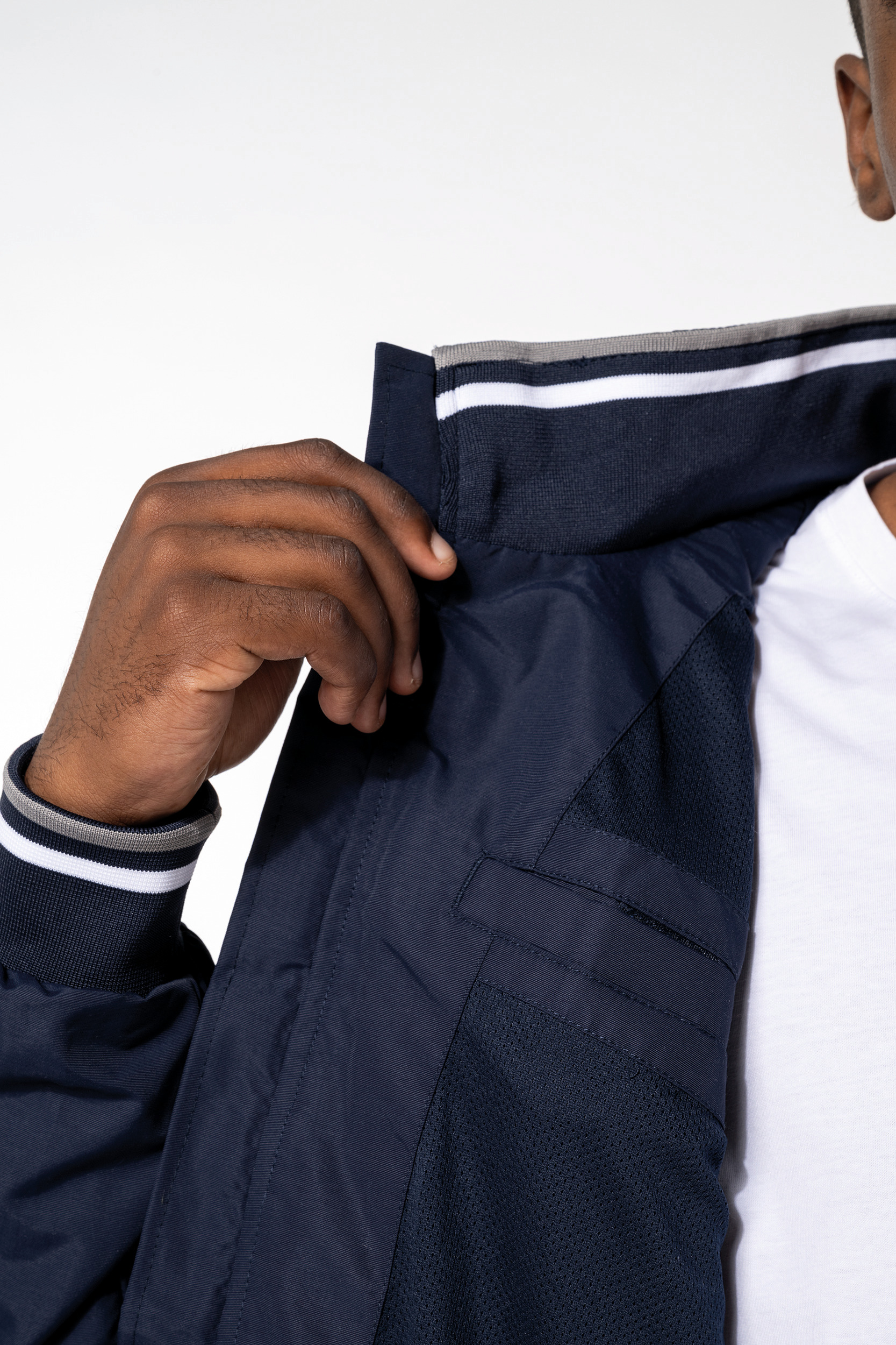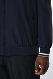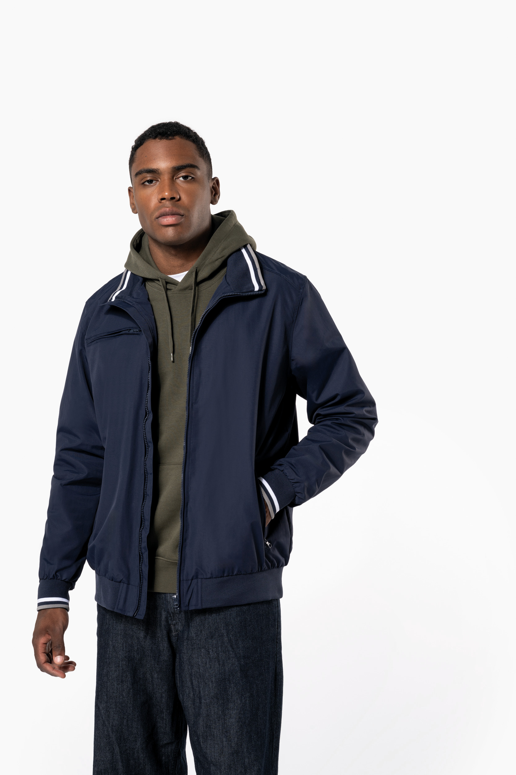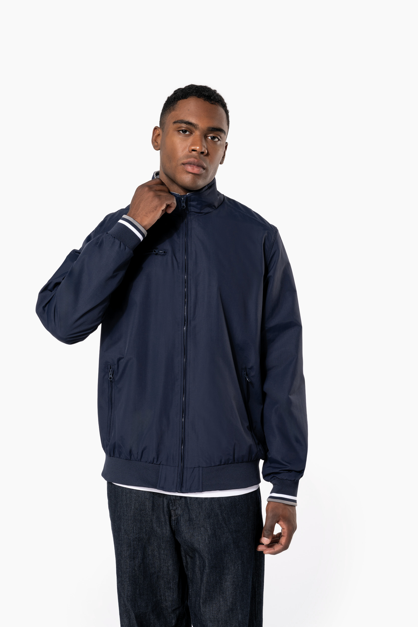100% polyamide ottoman Taslan. Doublure filet 100% polyester. Tissu résistant et mat. 2 poches zippées devant. 1 poche zippée poitrine. 1 poche intérieure. Intérieur col en bord-côte avec rayures contrastées. Doublure filet. Bas de vêtement en bord-côte uni. Bas de manches en bord-côte avec rayures contrastées. Zip pour la personnalisation.
