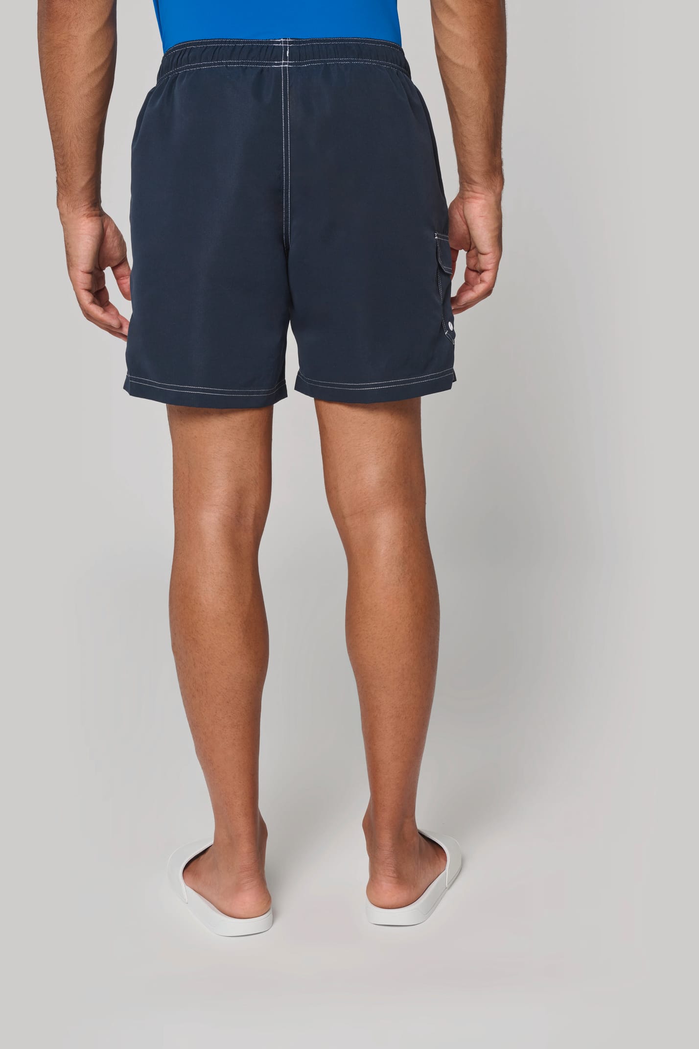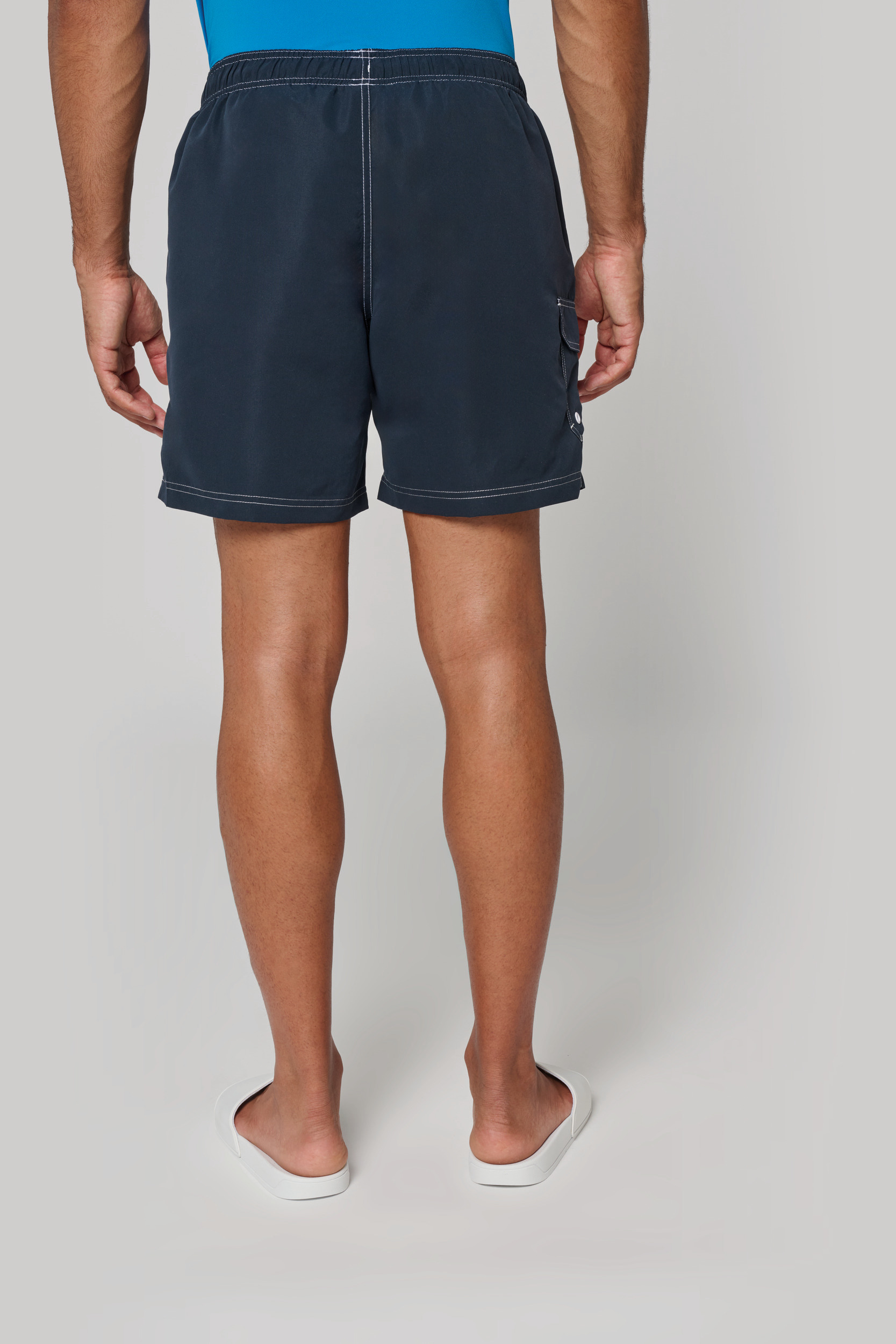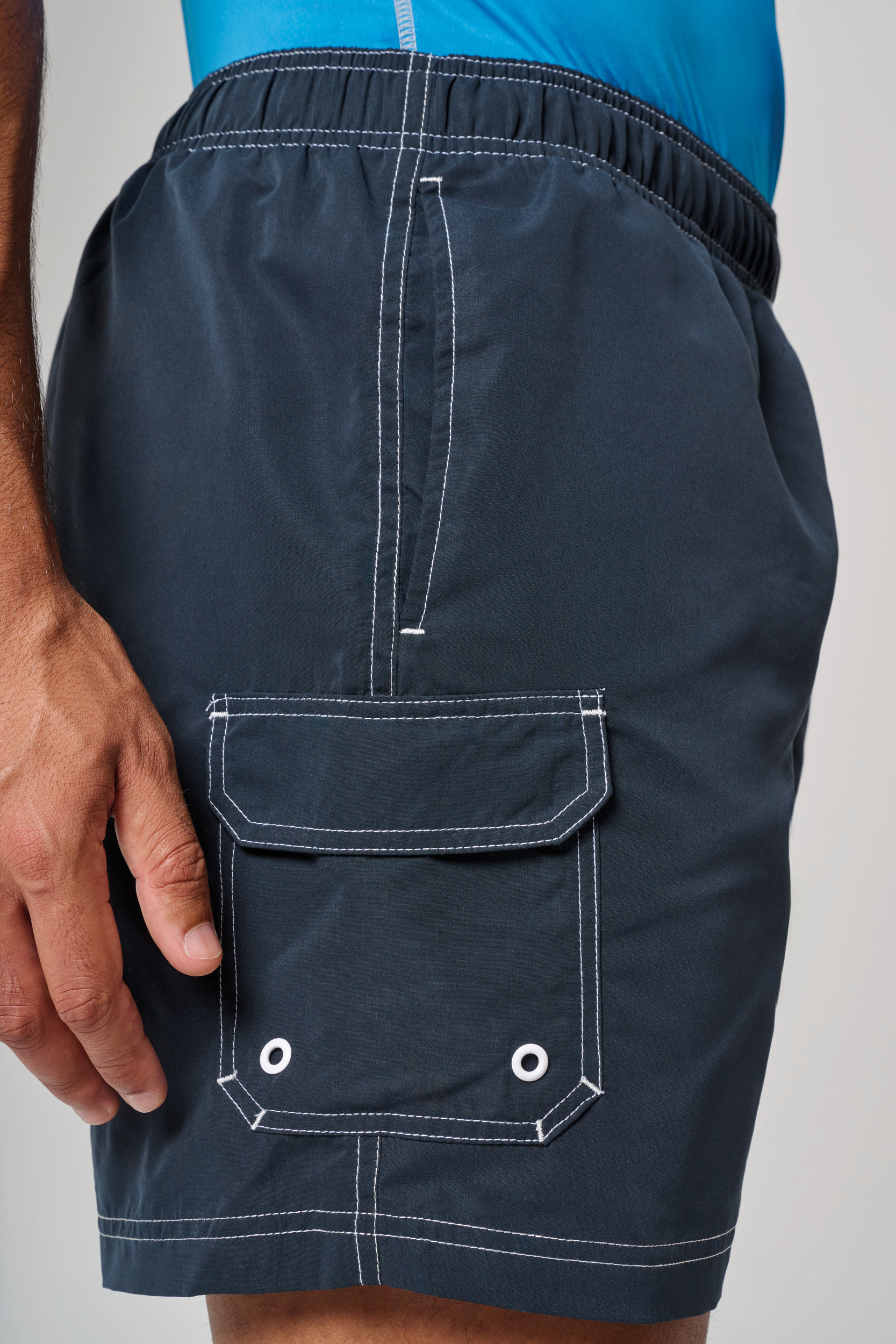 100% polyester microfibre. Tissu toucher peau de pêche. Ceinture élastiquée avec cordon de serrage. Slip intégré en maille filet. 2 poches côté et 1 poche plaquée avec rabat et œillet. Finition surpiqûres contrastées.