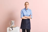 70% coton / 30% polyester sergé. Coutures contrastées sur la poche centrale divisée en 4 compartiments prévus pour tablette et/ou terminaux CB. Rivets en cuivre. Cordons dans le même tissu que le tablier et de longueur suffisante pour être doublés et noués à l'avant. Largeur 79 cm. Longueur 39,5 cm. Longueur des cordons 106 cm. Lavage industriel 85°. Lavage domestique 60°.