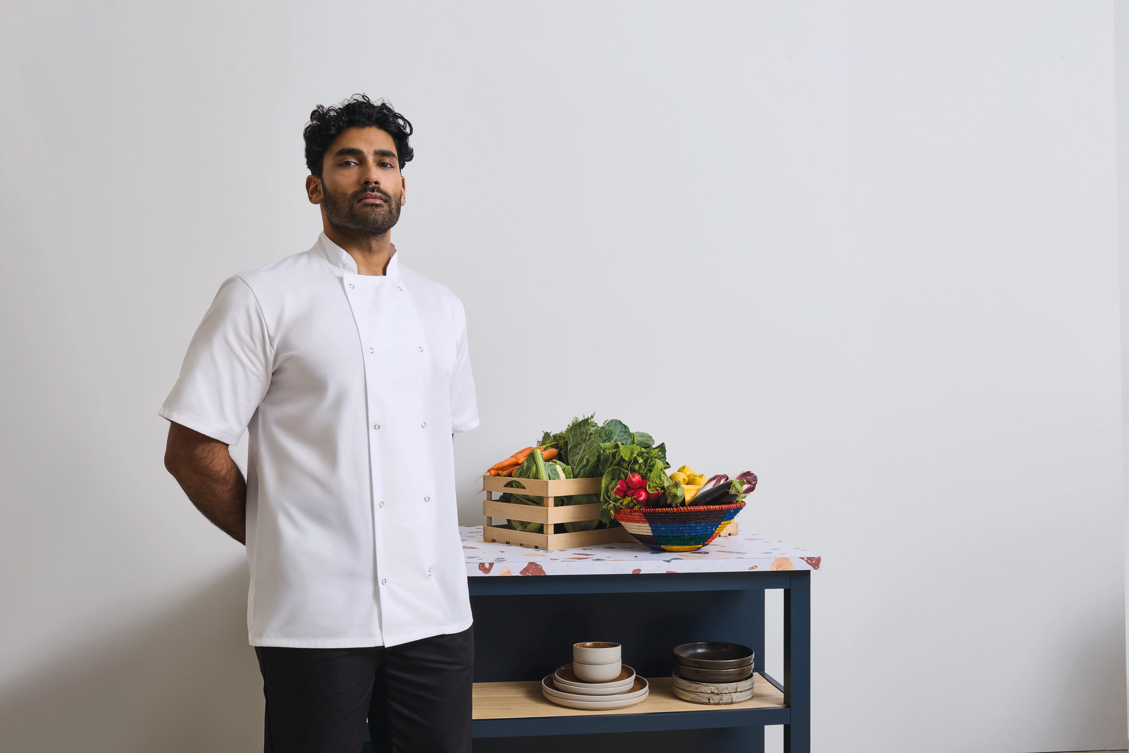 65% polyester / 35% coton twill. Doux au toucher. Veste facile à enlever grâce à ses boutons pressions. Col mao avec surpiqûres. Lavage industriel à 85°. Lavage domestique à 60°.