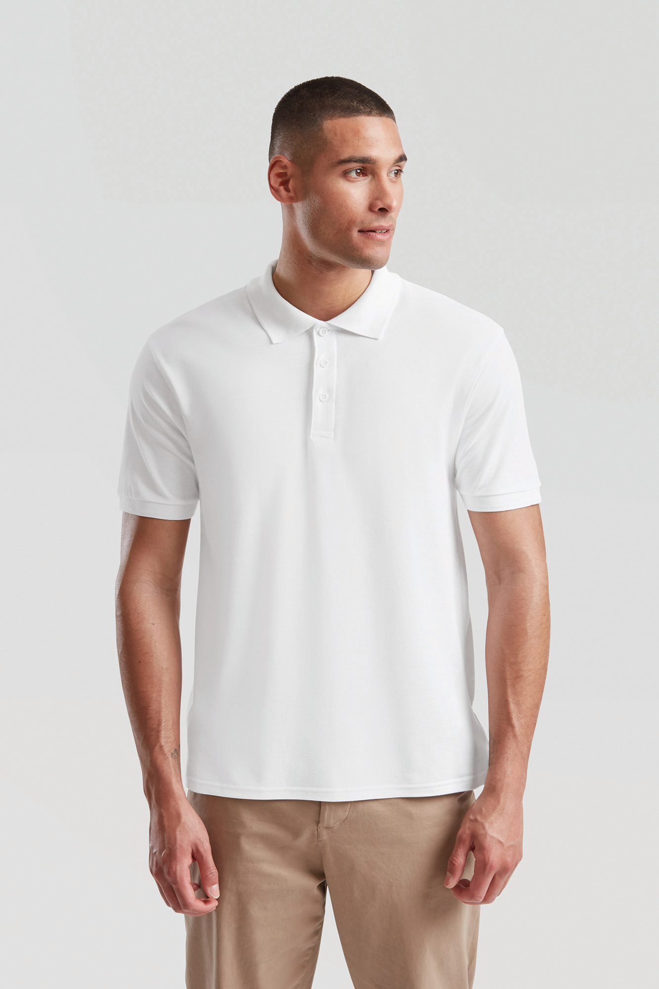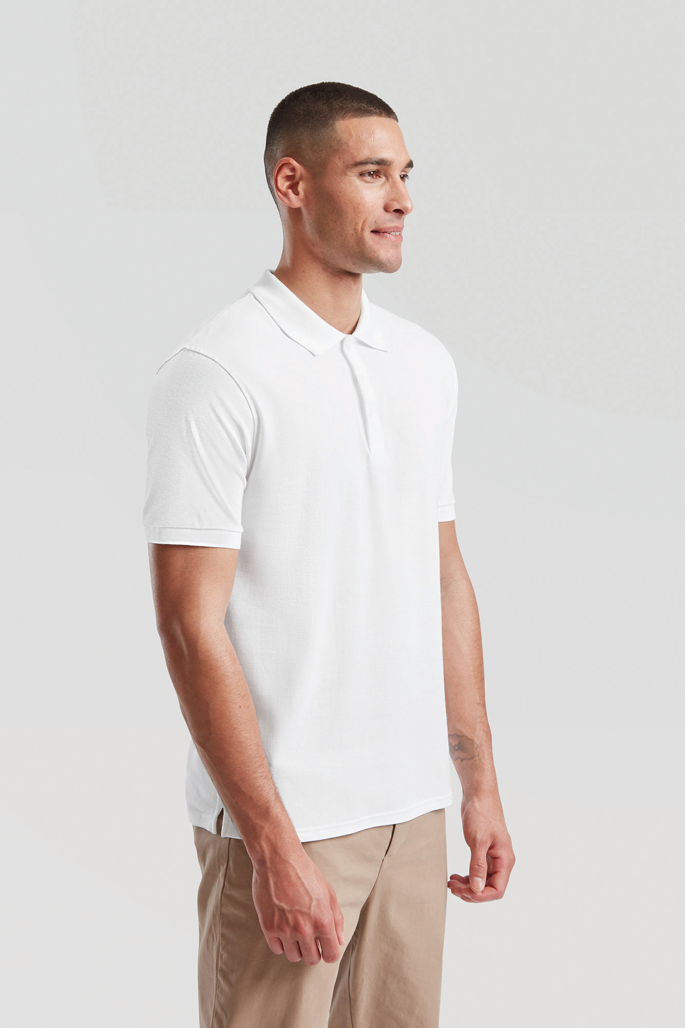 100 % coton piqué (Heather Grey : 97% coton / 3% polyester). Bas de manche en bord-côte. Patte avec trois boutons ton sur ton. Fentes sur le côté.