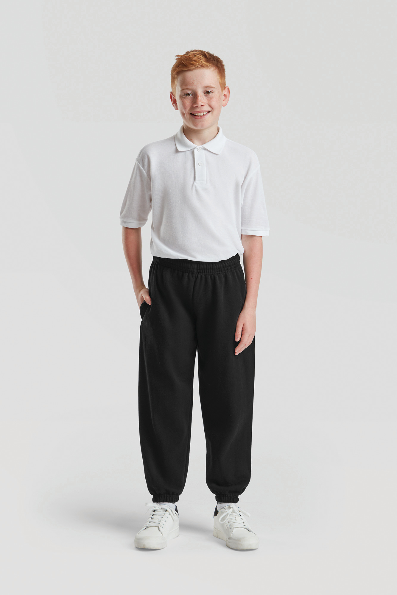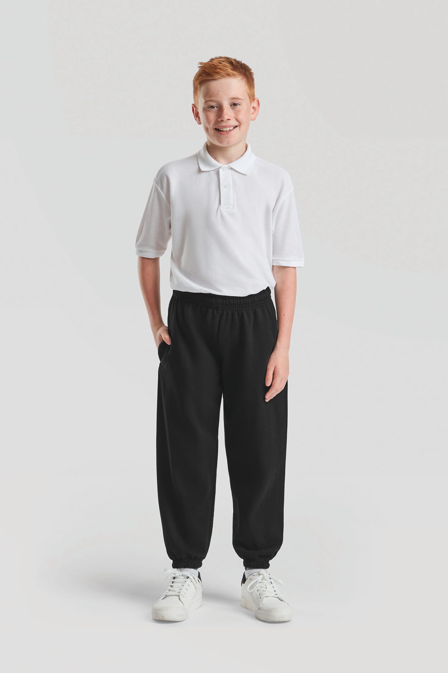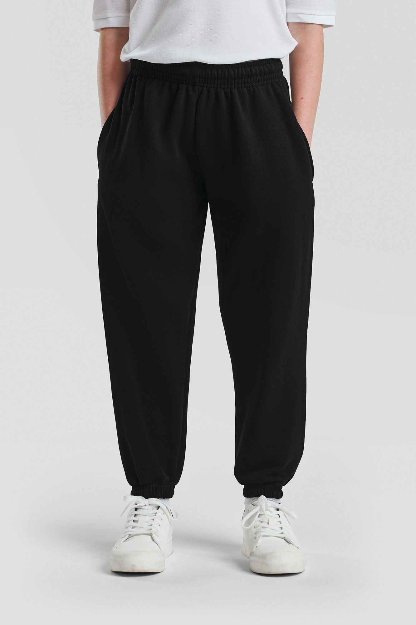 Sauf Heather Grey : 260 g/m². 80% coton / 20% polyester. Ceinture élastique avec cordon de serrage en continu (en conformité avec la législation européenne des vêtements pour enfants). Chevilles élastiques. Poches latérales.